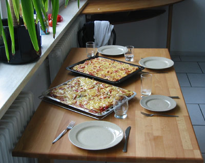 Eigentlich wollten wir eine Fußgänger-Ralley mit anschließendem Pizzabacken durchführen. Wegen des Regens kam es aber nur zum Pizzabacken. Das Foto zeigt den etwas eigenwilligen Serviervorschlag Zwei Bleche für vier Esser.