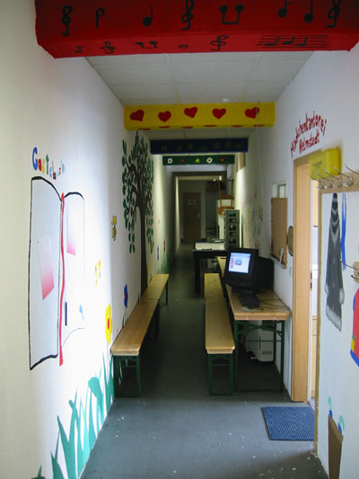 Herzlich willkommen im Chorheim der Mädchenkantorei. Das Bild zeigt unseren Flur mit Garderobe, Chorcomputer und diversen Möglichkeiten zum Spielen.