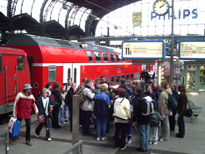 Die langersehnte Reise nach Südafrika begann! Um 09.40 Uhr war Treffen mit dem Chor am Bahnhof, wo alle sehr pünktlich erschienen. Wir machten in der Bahnhofshalle einen großen Kreis mit allen Leuten vom Chor, die am Bahnhof waren, nahmen uns an die Hände und sangen zur Verabschiedung: Irish Blessing! Am Bahnsteig sangen wir noch unser berühmtes Volkslied: Heute wollen wir das Ränzlein schnüren. Dann fuhr der Zug endlich los. Endstation war der Hamburger Hauptbahnhof. Von da aus ging es mit der U-Bahn zum Flughafen, wo uns Familie Lippelt unsere Koffer brachte. Für manche war es der erste Flug und wir waren alle sehr aufgeregt. Doch dann waren wir auch schon in der Luft und landeten nach 2 Stunden in Paris. Dort war der Aufenthalt sehr lange und wir nutzten die Zeit um uns bettfertig zu machen. Nachts flogen wir mit der Air France, Boing 747 nach Johannesburg. So flogen wir alle zum ersten Mal über Europa hinaus! Luisa Ackermann |
