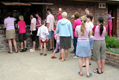 Der Tag begann ca. um 6.00 Uhr, als Lammy uns mit seiner wohlbekannten und zweifellos feinfühligen Art mehr oder weniger zärtlich aus den Betten trällerte. Erst einmal wach, begannen wir sofort, uns für den bereits vor der Reise ausgeheckten Streich zu präparieren. Pünktlich zum Morgenappell stand dann der gesamte Chor in rosa bis pinken T-Shirts vor seinem geschockten Leiter, der schmerzhaft das Gesicht verzog. Man muss dazu sagen, dass Lammy diese Farben ungefähr so gern hat, wie der Teufel das Weihwasser. Beglückt über den gelungenen Streich begaben wir uns dann zu Tisch und frühstückten ausgiebig.