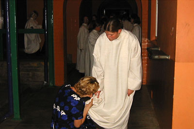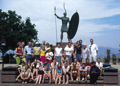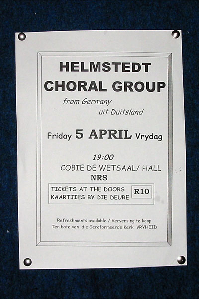 Chris hofft, dass der Sprit reicht und fährt uns nach Vryheid wieder schneller als erwartet. Also Zeit für jüngste Geschichte. Wir besuchen das Loch! Erinnerungen werde wach. Danach folgt die Quartierverteilung. Wenn deutsche Organisatoren im Spiel sind, hat jede Gastfamilie einen Zettel mit den Namen der Gäste. Wie schön! Wir ziehen zu Vivien, semi-pensionierte Grundschullehrerin mit starken Mottenkugeln im Gästezimmer. Dafür gibt es keine Dusche. Um 6 h ist Treffen zum warming up und um 7 h Konzert in der Grundschule. Alles gut mit playback. Kompaktplattenspieler mit Macht! Vivien erzählt viel und anstrengend. Bald sind wir müde, packen und schlafen ein. Der Bericht stammt von Holger Becker. |