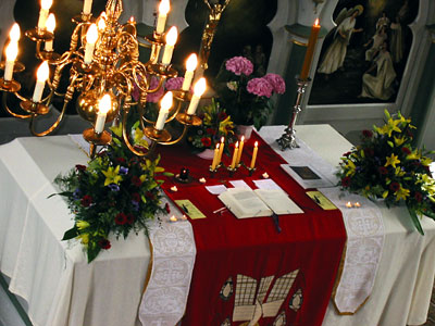 Der festlich geschmückte Altar mit fünf Kerzen für fünf Konfirmandinnen und Konfirmanden.