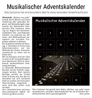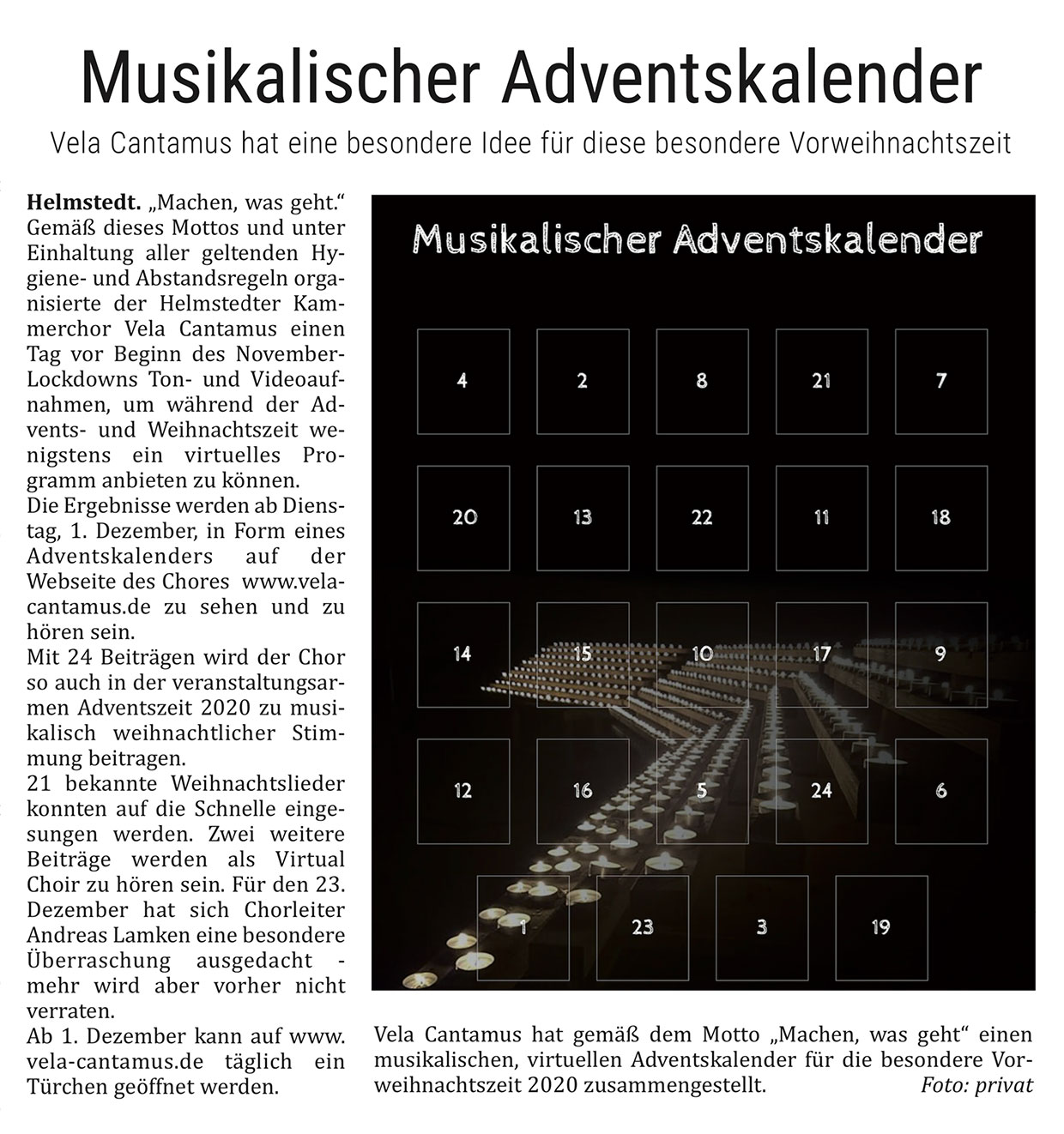 Machen, was geht! Gemäß diesem Motto und unter Einhaltung aller geltenden Hygiene- und Abstandsregeln hatten wir kurz vor Beginn des November-Lockdowns Ton- und Videoaufnahmen organisiert, um während der Advents- und Weihnachtszeit 2020 wenigstens ein virtuelles Programm anbieten zu können. Die Ergebnisse waren ab dem 1. Dezember 2020 in Form eines Adventskalenders auf dieser WebSite zu sehen und zu hören. Mit 24 Beiträgen konnten wir so auch in der veranstaltungsarmen Adventszeit 2020 zu musikalisch weihnachtlicher Stimmung beitragen. Am 1. November 2020 haben wir auf die Schnelle 21 bekannte Weihnachtslieder eingesungen. Zwei weitere Beiträge wurden im Dezember 2020 als Virtual Choir produziert. Hinter dem Türchen des 23. Dezember verbarg sich eine Collage aus dem adventlichen, weihnachtlichen und winterlichen Alltag unserer Sängerinnen und Sänger. |