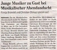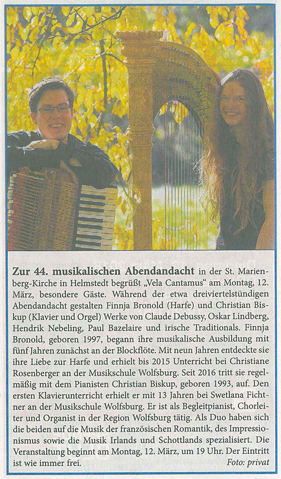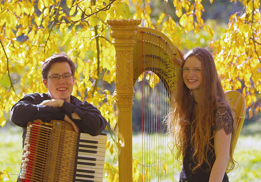 Finnja Bronold, geboren 1997, begann ihre musikalische Ausbildung mit fünf Jahren zunächst an der Blockflöte. Mit 9 Jahren entdeckte sie ihre Liebe zur Harfe und erhielt bis 2015 Unterricht bei Christiane Rosenberger an der Musikschule Wolfsburg. In dieser Zeit nahm sie u. a. erfolgreich als Solistin sowie im Ensemble bei Jugend Musiziert teil. Momentan spielt sie im Orchester der Universität Lüneburg und tritt solistisch als auch in anderen Besetzungen auf. Seit 2016 tritt sie regelmäßig mit dem Pianisten Christian Biskup, geboren 1993, auf. Den ersten Klavierunterricht erhielt er mit 13 Jahren bei Swetlana Fichtner an der Musikschule Wolfsburg. Er ist als Begleitpianist, Chorleiter und Organist in der Region Wolfsburg tätig. Seine besondere Leidenschaft gilt der skandinavischen Musik, welche er oft nach Jahren des Vergessens dem Konzertpublikum wieder zugänglich macht. Als Duo haben sich die beiden auf die Musik der französischen Romantik, des Impressionismus sowie die Musik Irlands und Schottlands spezialisiert. |
