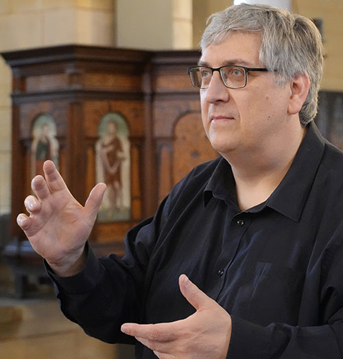 ANDREAS LAMKENwurde 1965 in Helmstedt geboren. Die ersten Kontakte zur Chormusik erhielt er im Alter von fünf Jahren durch das Singen im Knabenchor. Während der etwa 20-jährigen Mitwirkung bei den Helmstedter Chorknaben als Sänger und Präfekt unter der Leitung Helfrid Israels, lernte er Chorliteratur aller Epochen und Gattungen kennen. Gleichzeitig erhielt Andreas Lamken hier seine grundlegende Chor-, Stimmbildungs- und Chorleiterausbildung. Klavierunterricht bei Anatoli Vodovoz und Orgelunterricht bei Christa Pohlitz ergänzten die Ausbildung im instrumentalen Bereich. Seit 1981 ist er als Kirchenmusiker für verschiedene Gemeinden tätig. Von 1987-1998 leitete Andreas Lamken das Männerchor-Doppelquartett "Double Quartett Singing Club", 1991-1999 den Helmstedter Kammerchor und von 1993-2003 die Mädchenkantorei Helmstedt, die aus dem Helmstedter Mädchenchor hervorging. Seit 2006 obliegt ihm die Leitung des neu gegründeten Helmstedter Kammerchores (jetzt Kammerchor VELA CANTAMUS), der 2011 mit dem Canta-Sacra-Stipendium für geistliche Chormusik ausgezeichnet wurde. Hauptberuflich betreibt er das Unternehmen prospect Studio-Label-Verlag, das seit über zwanzig Jahren in den Bereichen Tonstudio, Grafikstudio, IT-Studio, Tonträgerlabel und Musikverlag tätig ist. Im Rahmen dieser Tätigkeit pflegt Andreas Lamken enge nationale und internationale Kontakte mit Interpreten und Komponisten, die seinen musikalischen Horizont regelmäßig erweitern und damit stets eine wertvolle Quelle für seine Arbeit als Chorleiter bilden. |