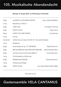Seit über zwanzig Jahren treffen sich etliche Kirchenmusikerinnen und Kirchenmusiker unserer Region regelmäßig und reihum zum „Kantorenfrühstück“. Im Mai vergangenen Jahres hatte Kantor Matthias Laidler aus Schöningen erstmals die Idee, ein Orgelkonzert mit den Teilnehmern dieser Runde zu veranstalten. Wir griffen den Gedanken auf und wiederholten das Konzert im Rahmen unserer 95. Musikalischen Abendandacht im August 2024. Nun war es wieder soweit: Am 18. August 2025 ab 19.00 Uhr musizierten bei der 105. Musikalischen Abendandacht: Matthias Wengler, Christian Mellin, Andreas Schultz, Andreas Lamken, Andreas Witlake, Gerhard Strub und Matthias Laidler.