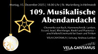2025-12-15 | Montag | 18.00 Uhr | Kirche St. Marienberg in Helmstedt 109. Musikalische Abendandacht VELA CANTAMUS singt unter der Leitung von Andreas Lamken adventliche und weihnachtliche Chorwerke. |